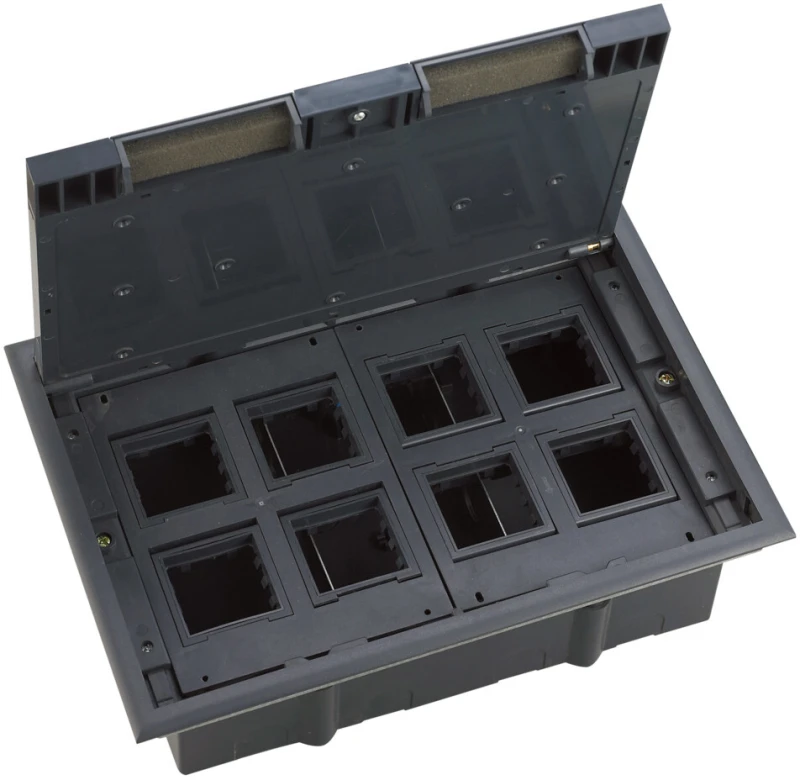 MultiDesk Лючок предназначен для установки в фальшпол толщиной 5…50 мм. Монтажная коробка идёт в комплекте. В лючок можно установить до 16 модулей (8 постов) ЭУИ стандарта 45 мм, например, модульные ЭУИ W45. Лючок выполнен из пластика и имеет степень пылевлагозащиты IP40 при закрытой крышке, механическая стойкость - IK10. Сторону открывания крышки лючка можно менять. Имеется регулировка лючка по высоте - от 74 до 105 мм. Крышка лючка усилена металлической пластиной. Поставляется без ЭУИ.