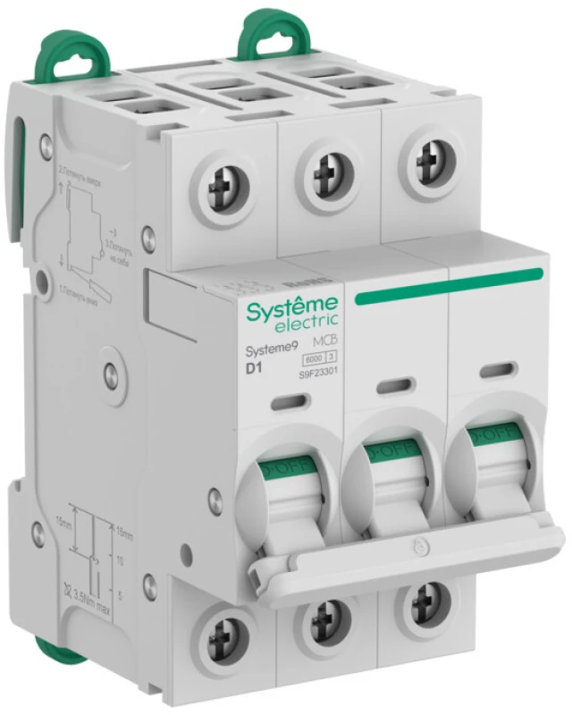 Автоматический выключатель S9FN, серии Systeme9, Systeme Electric, 3-полюсный, номинальный ток 1 А, характеристика D, Icn = 6 кА, Icu = 10 кА. Соответствует требованиям стандартов ГОСТ IEC 60898-1 и ГОСТ IEC 60947-2. Применяется в электрических сетях напряжением 400 В. Предназначен для защиты цепей от перегрузок и токов короткого замыкания. Оснащен двойными безопасными клеммами раздельного монтажа проводников, механизмом мгновенной коммутации, индикаторами состояния контактной группы и срабатывания по причине аварии. Монтируется на DIN-рейку при помощи двухпозиционных защёлок, с возможностью демонтажа без снятия шины PIN.
