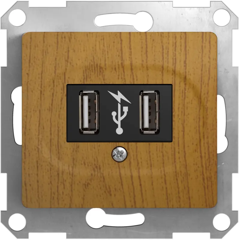 Механизм Schneider Electric Glossa (цвет дерево дуб) розетки для зарядки с двумя разъёмами USB с выходными напряжением 5 В постоянного тока и выходами с номинальным током по 1,4 А.