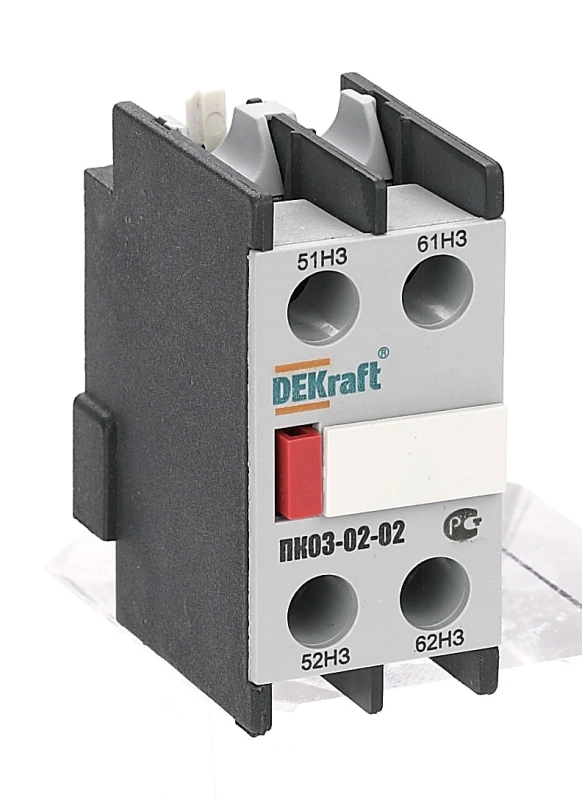 Приставка контактная серии ПК-03-02 для контакторов КМ-103 DEKraft; кол-во контактов - 2НЗ; ном.ток – 10 А; ном.напряжение – до 690 В; установка – с лицевой стороны; степень защиты – IP20. Приставки контактные предназначены для увеличения количества вспомогательных контактов контактора. Контактные приставки механически соединяются с контакторами и фиксируются при помощи защелки. Приставка подходит для использования с контакторами других производителей.