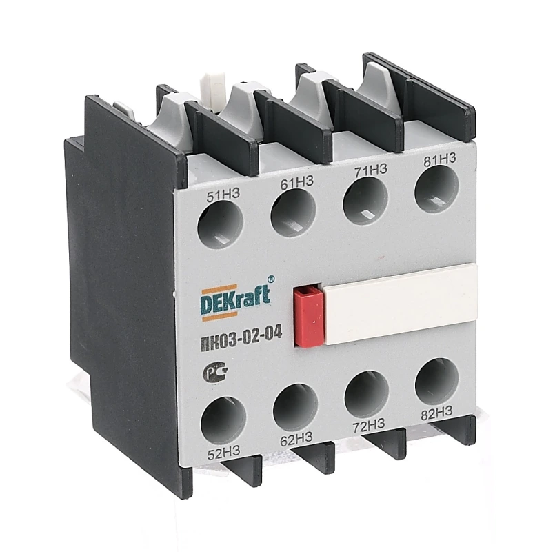 Приставка контактная серии ПК-03-02 для контакторов КМ-103 DEKraft; кол-во контактов - 4НЗ; ном.ток – 10 А; ном.напряжение – до 690 В; установка – с лицевой стороны; степень защиты – IP20. Приставки контактные предназначены для увеличения количества вспомогательных контактов контактора. Контактные приставки механически соединяются с контакторами и фиксируются при помощи защелки. Приставка подходит для использования с контакторами других производителей.