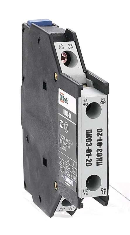 Приставка контактная серии ПК-03-01 для контакторов КМ-103 DEKraft; кол-во контактов - 2НО; ном.ток – 10 А; ном.напряжение – до 690 В; установка – с лицевой стороны; степень защиты – IP20. Приставки контактные предназначены для увеличения количества вспомогательных контактов контактора. Приставки боковой установки ПК-03-01 являются эксклюзивом и позволяют значительно сэкономить на глубине шкафа, который будет стоить дешевле.